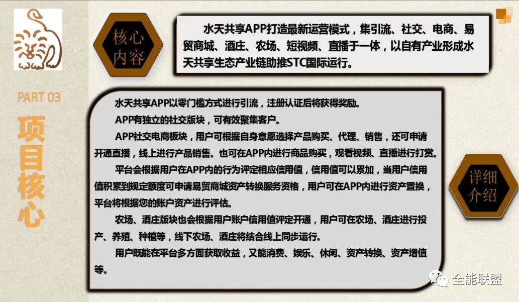 项目对接了银行、社交、转播助手、直播、小视频、电商带货、共享国际交易所、项目可发起众筹、任务包和生产可接资产转换,让你的所有虚拟资产全部可变现、解决你资金需求