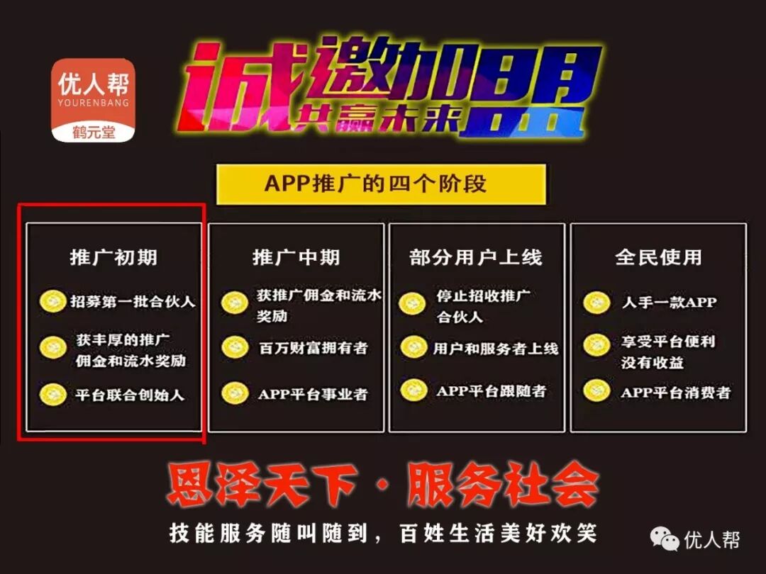 小编在此特别说明:优人帮技能共享前期招募80万的推广创业伙伴,需要一个独立的招商系统运营,与app独立分开,使app更加专业和细分,高规格地做好技能共享服务平台联动质量,日后招商结束系统使命完成,重要的端口就会接入到app后台,最后优人帮技能共享服务app将更专业更规范地为百姓服务,打造行业标杆领导者!优人帮旨在创造专业、专注、专心于技能共享服务大平台,剔除任何不必要的外链,使优人帮app更高端、大气、上档次的逼格行业制定者!