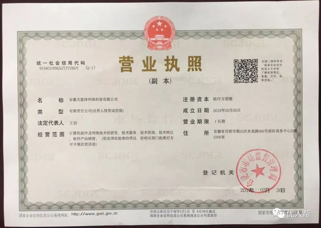 安徽省天恩泽集团于2019年3月26日注册成立天恩泽网络科技有限公司;重金打造一款随时匹配解决百姓生活各种问题服务平台,‘优人帮技能共享app’从此诞生了,旨在让天下服务随叫随到,优人帮《谐音有人帮及优秀的人来帮》以下概要介绍天恩泽网络科技有限公司。