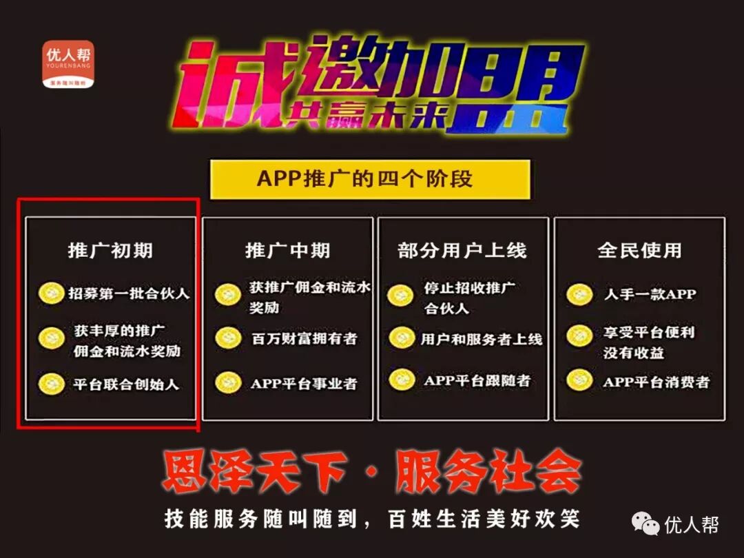 抢占优人帮公司合伙人,董事资格,享受公司业绩分红,抢占服务商,董事,合伙人,享受技能服务平台全国交易流水收入分红,博一次富三代,努力一次,成就几代人。百年不遇的绝佳事业机会,宁可明明白白的放弃,也不要糊里糊涂的错过。