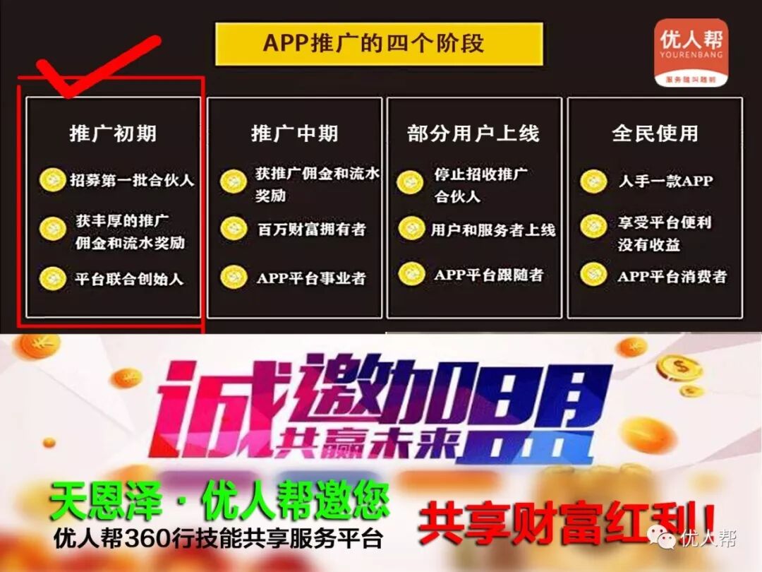 【优人帮】技能共享不是资金盘、互助盘、分红盘、拆分盘、返利盘、股权盘、支付盘、产品盘;也不是币圈、链圈、卡圈、彩圈、卖货圈,是打造一款多功能版滴滴、美团、携程综合性的及时服务平台;如果您在直销、网商、微商、实体店、项目盘、资金盘、这个商那个盘、无尽的重复销售、手工操作、售后痛苦、累了受伤了!没钱了!每月要还各种贷款信用卡,不知道如何爬起来了!天恩泽·优人帮技能共享帮您把过去失去的统统赚回来!