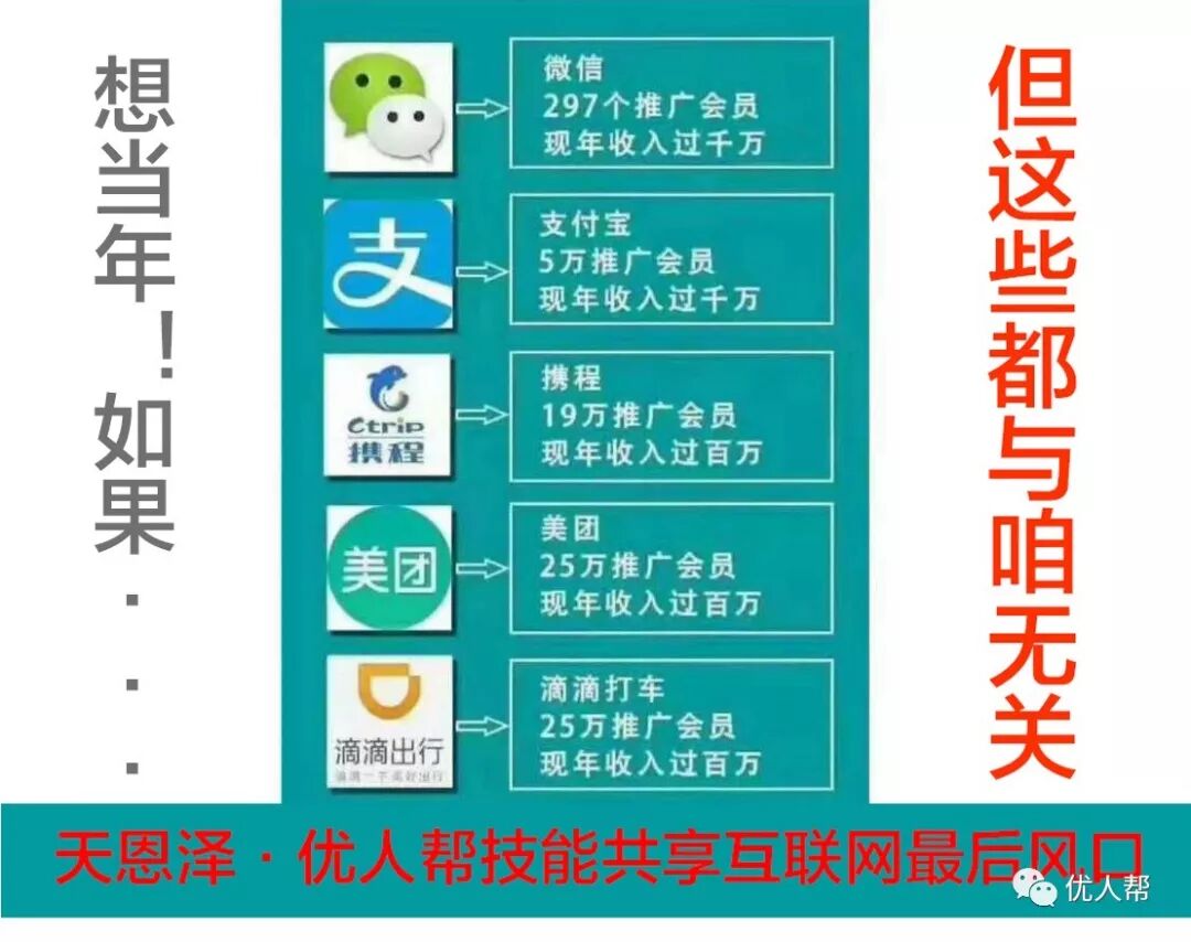如果十年前我鼓起勇气,买栋房子,到现在不知道赚多少,如果6年前参与了微信推广、如果参与了支付宝推广、如果参与了滴滴推广、如果参与了美团推广,那么现在已经是百万千万甚至更大的富豪了!