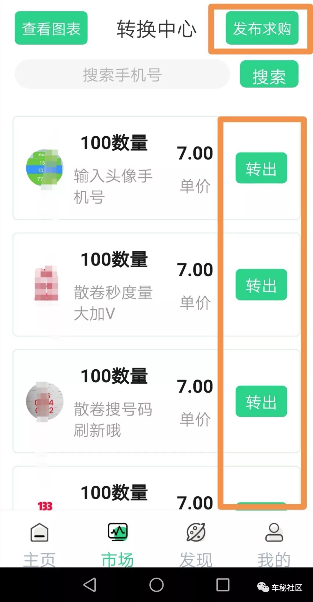 首页-市场。①购买:发布求购。②卖出:转出。