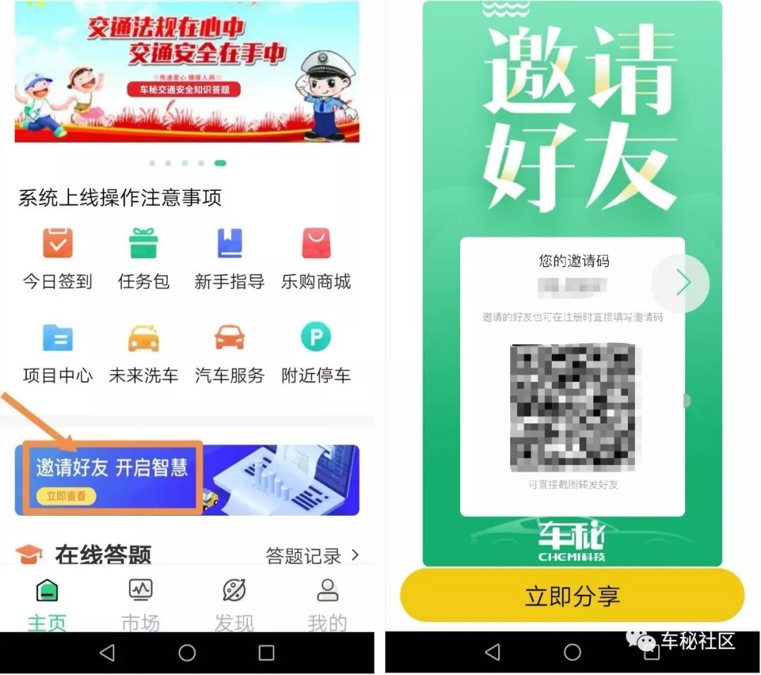 首页-点击‘邀请好友 开启智慧’-自动生成邀请二维码-点击‘立即分享’分享给微信好友或朋友圈。