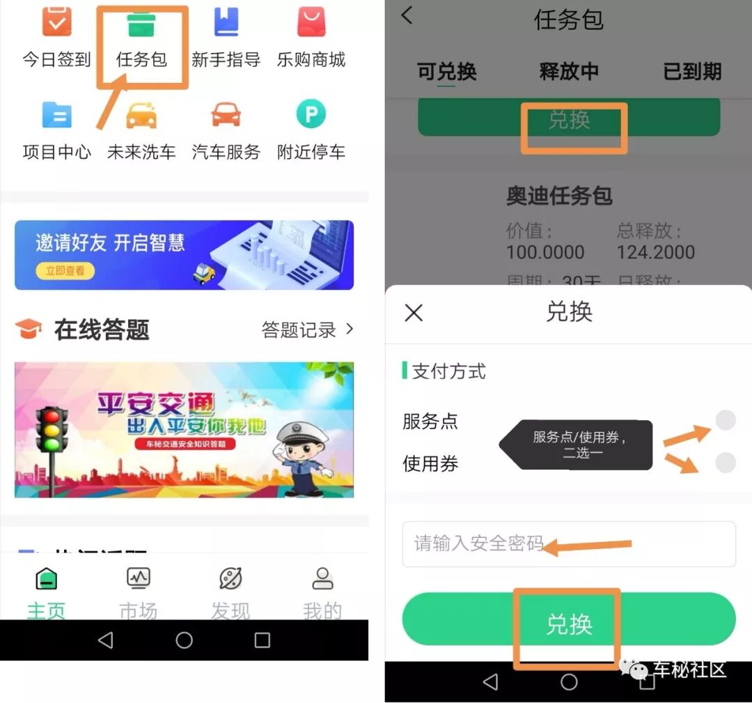 首页-任务包-可兑换-兑换-支付方式可以是‘服务点’或‘使用券’-输入安全密码-兑换。(在‘任务包’-‘释放中’,能查看到购买到的任务包)