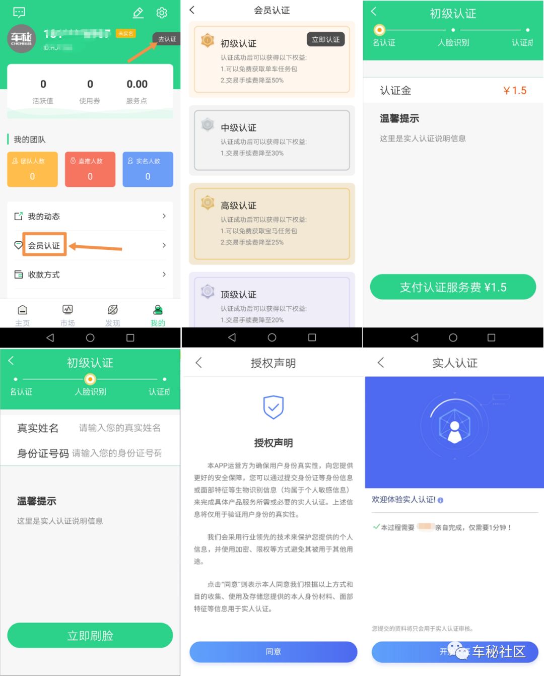 首页-我的-会员认证-初级认证-支付认证服务费1.5元-输入姓名、身份证号码-立即刷脸-认证成功。