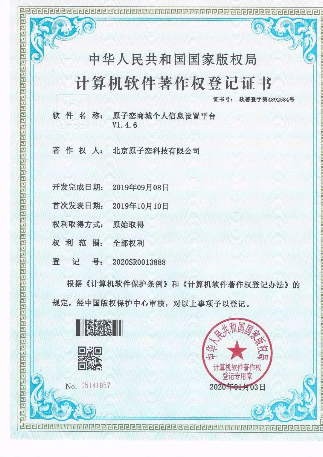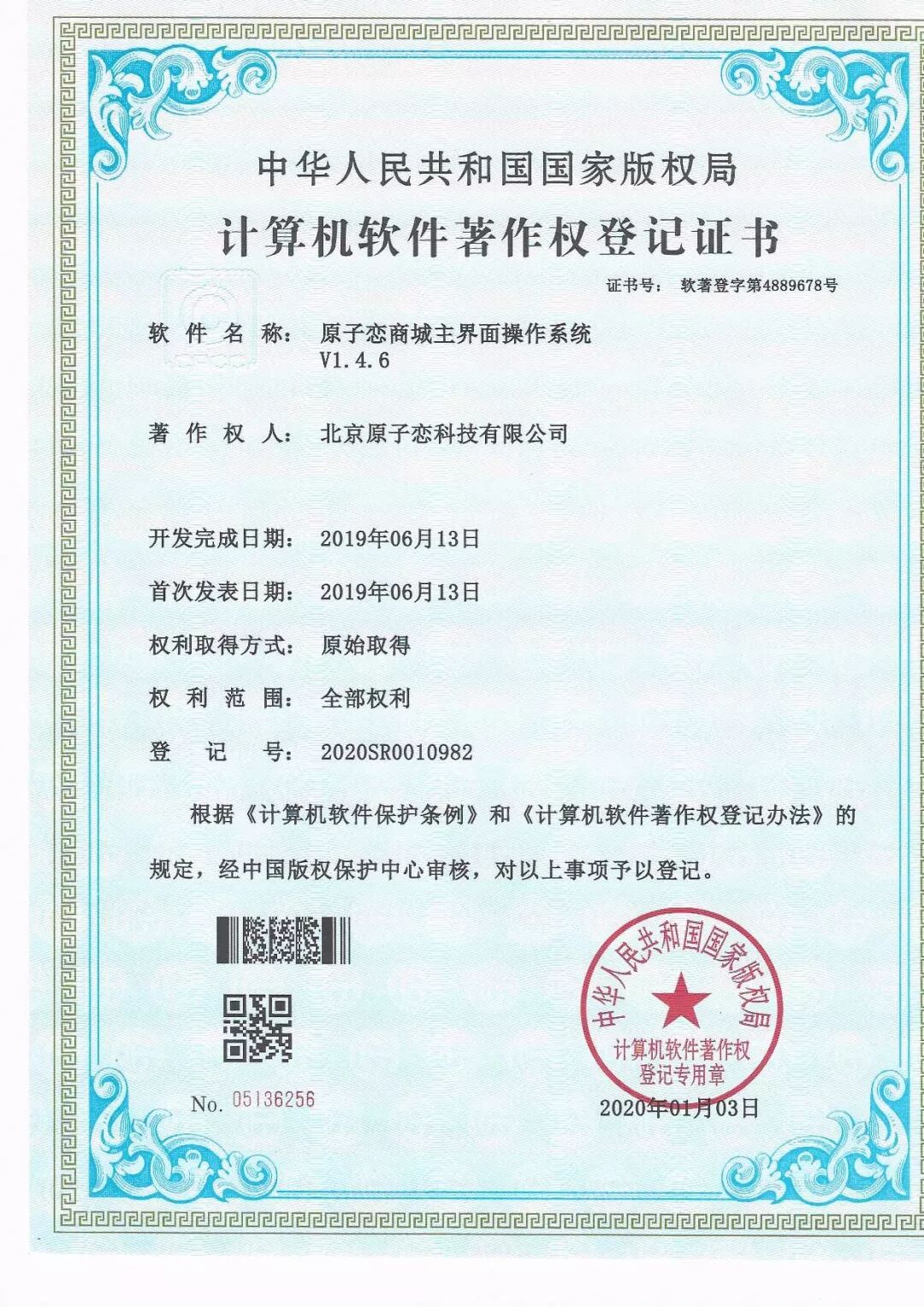 喜讯!原子恋商城获得六项国家版权局颁发的软件著作权证书!