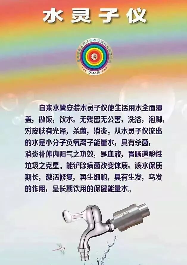 1、水灵子水通过光波分解,祛除自来水中的氯气、细菌及其它有毒有害物质,可直饮。