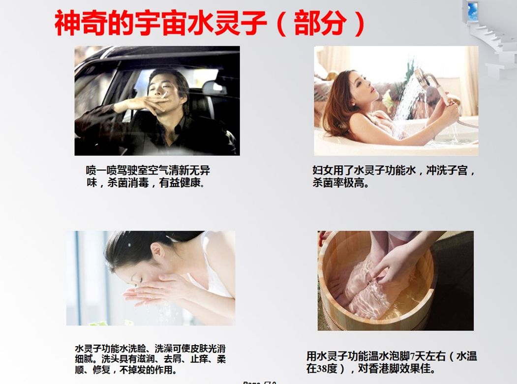 4.用水灵子的水洗脸,洗头,洗澡,刷牙,洗碗,更好更自然让皮肤美白光滑细腻,保湿滋润,除皱,去屑止痒,柔顺,白发转黑发,稀发变浓发,美白牙齿,预防牙周炎,让衣服更鲜亮等意想不到的效果!