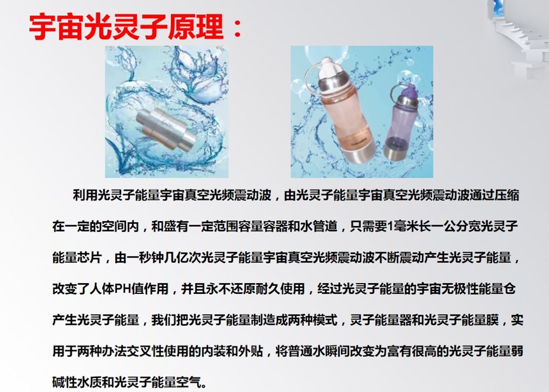 1.获得国家专利技术,是一种能瞬间改变酸性水,变成小分子水和净化空气的光灵子能量系统,由光灵子能量宇宙真空光频振动波通过压缩在一定的空间内,由一秒中几亿次宇宙真空光频振动波所产生的光灵子能量,作用于水改变水的质量!