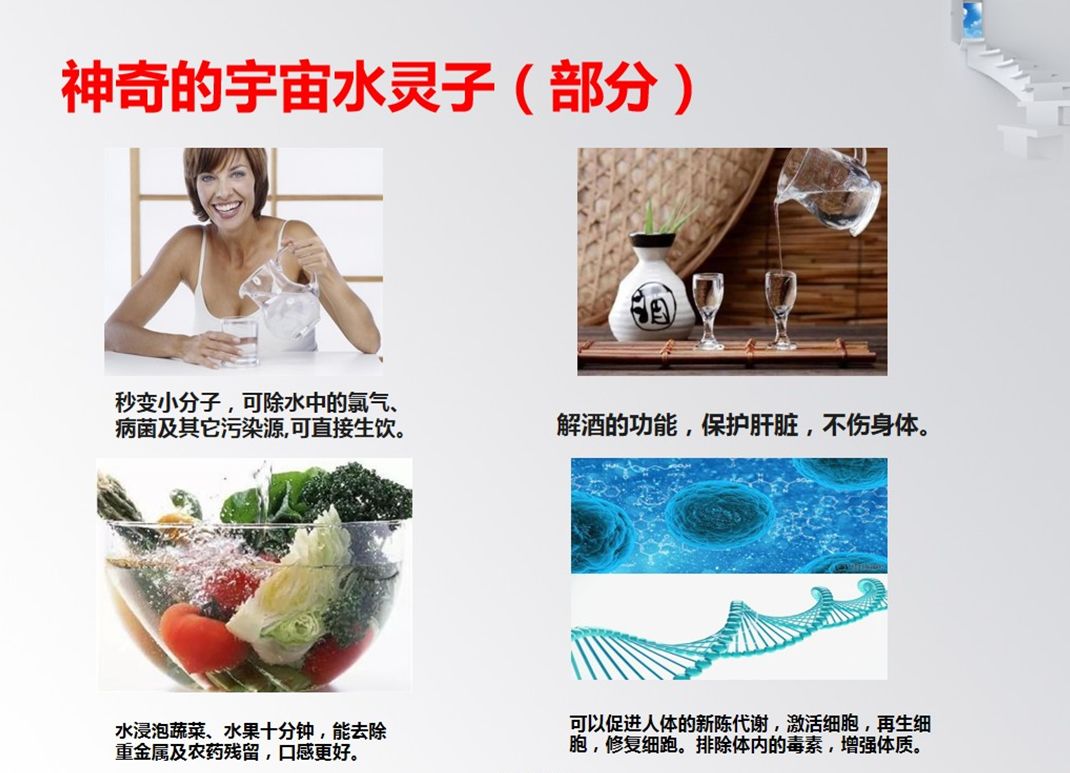 5.喝水灵子的水不会肚子胀,可以直接被细胞吸收。水灵子水不需要人体酶转换,直接3秒钟进入细胞,16秒净化到全身血液,燃烧体内脂肪,稀释血稠度,