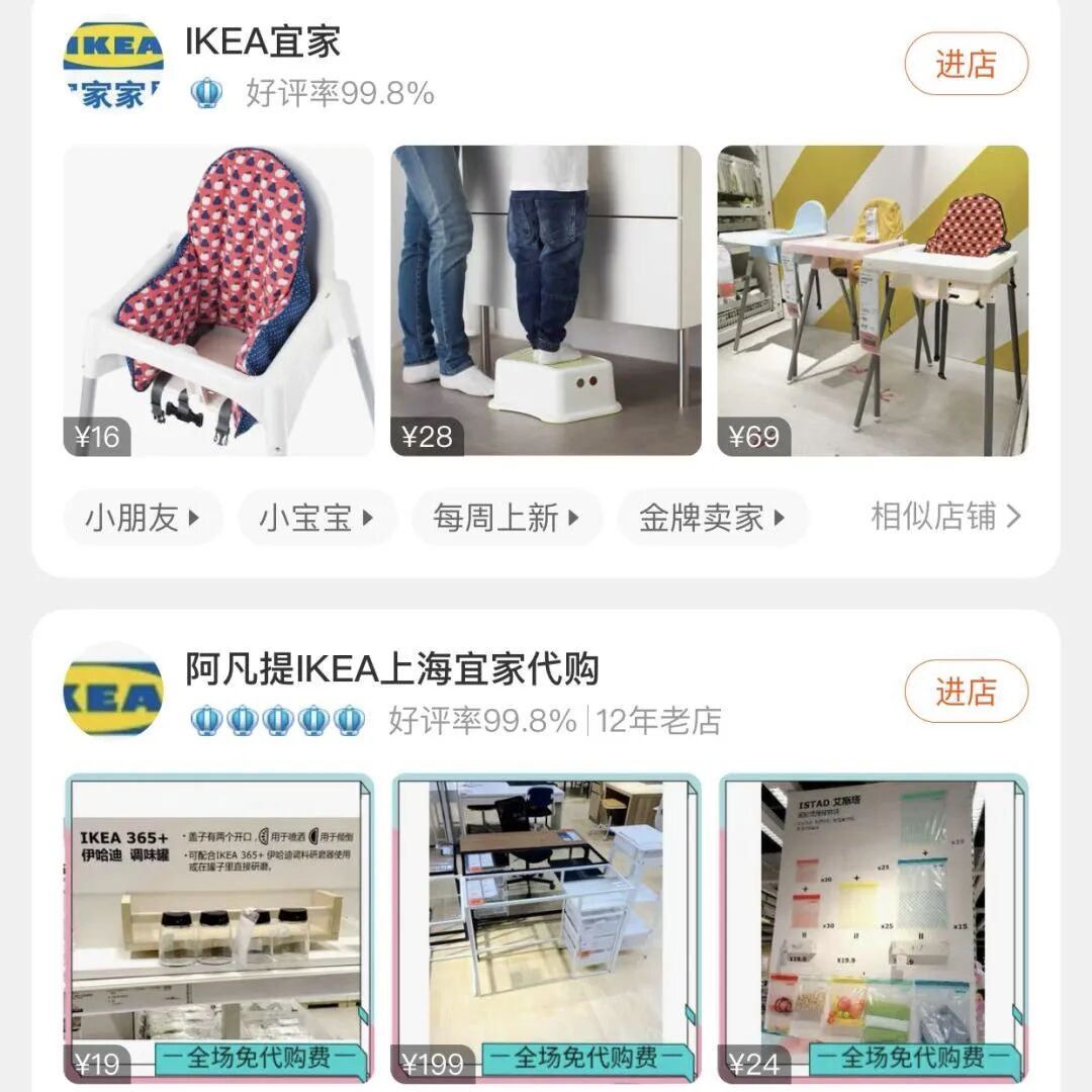 在“正主”左顾右盼的十几年里,搜索“宜家”呈现的几乎全是代购店铺,“阿凡提IKEA上海宜家代购,12年老店”、“大连温馨宜家代购,10年老店”、“滋滋宜家代购,11年老店”、“我淘我秀宜家代购,14年老店”...其中不少店铺粉丝超过10万。