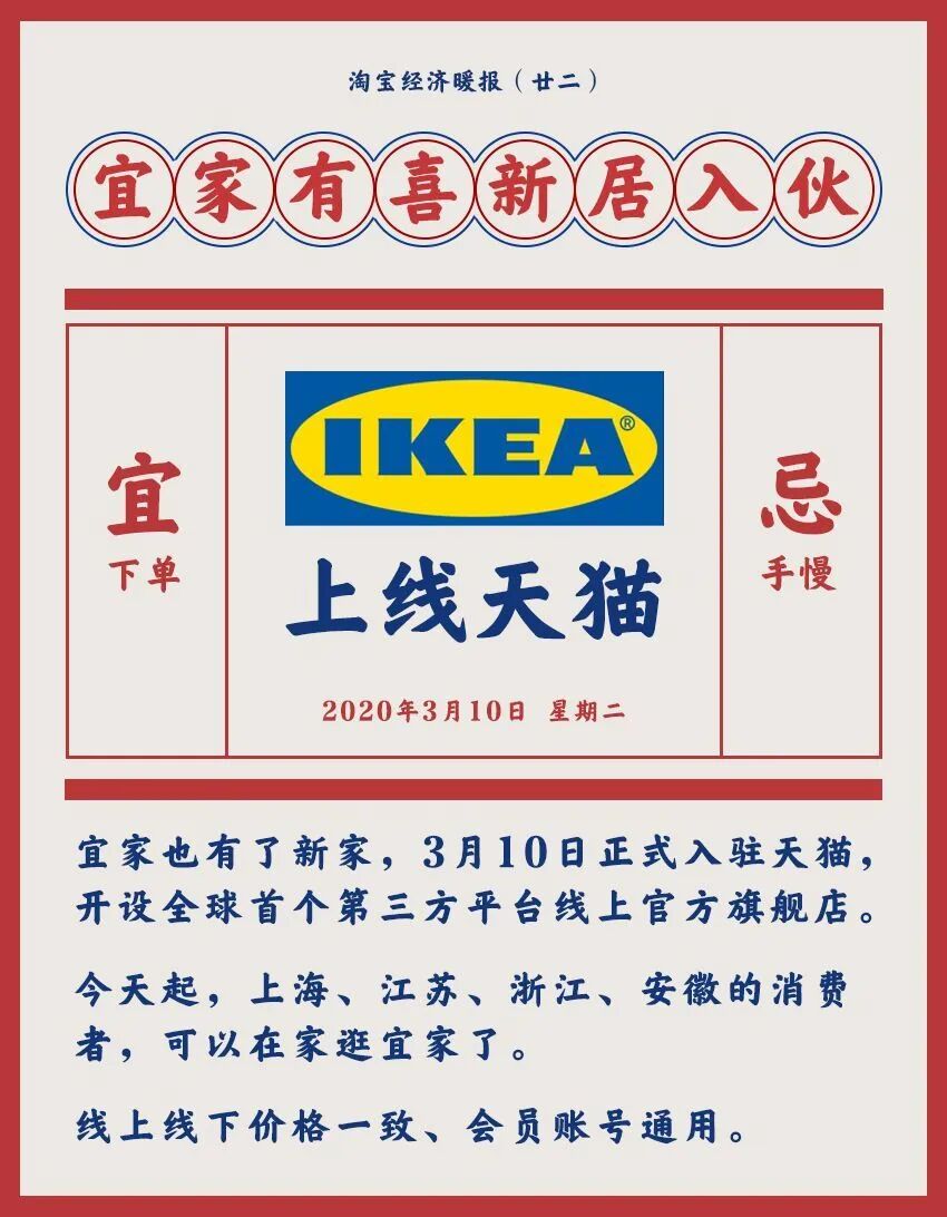 3月10日天猫喜迎外宾——宜家家居IKEA首次入驻天猫。网上一片欢呼雀跃,直播弹幕中也有人调侃:疫情之下,宜家也扛不住开网店了。