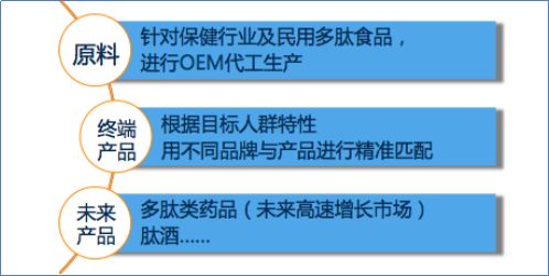 通过与亚宝集团这样的医药集团合作,依托自有中国中医科学院中草药小分子研究中心的研发成果,以牡蛎肽、地龙肽、三七肽、葵花碱肽等效果显著的中药草单品为手段,聚焦一到两个行业,做深做透,占据品类翘楚地位。