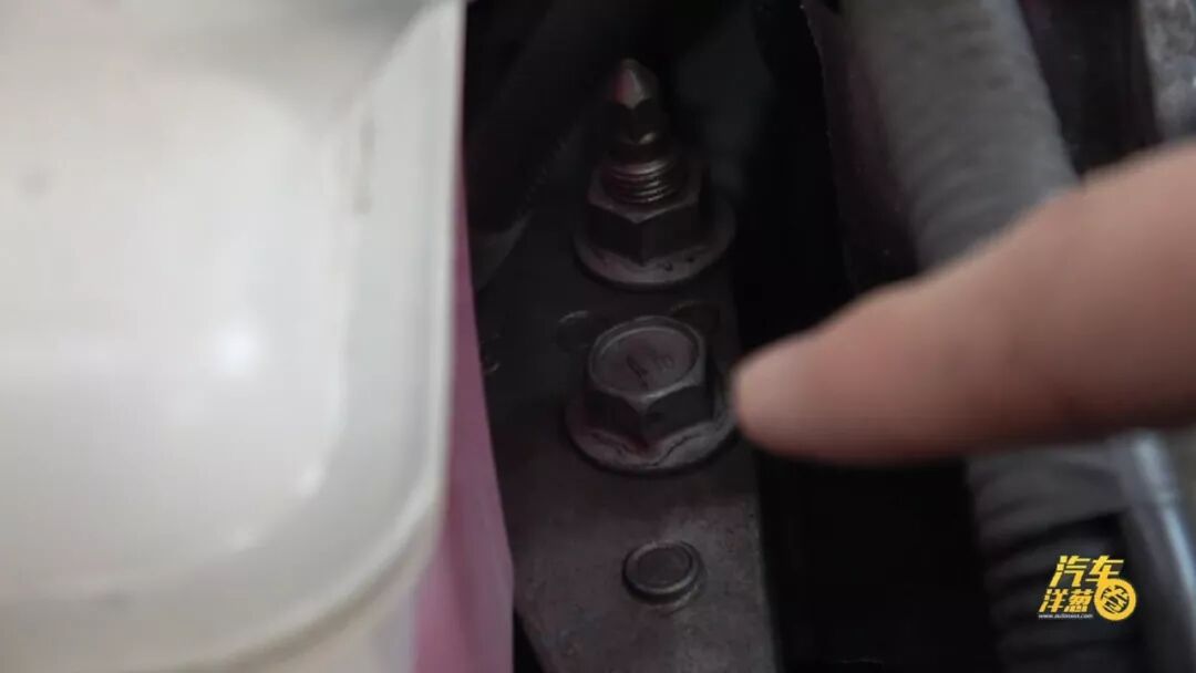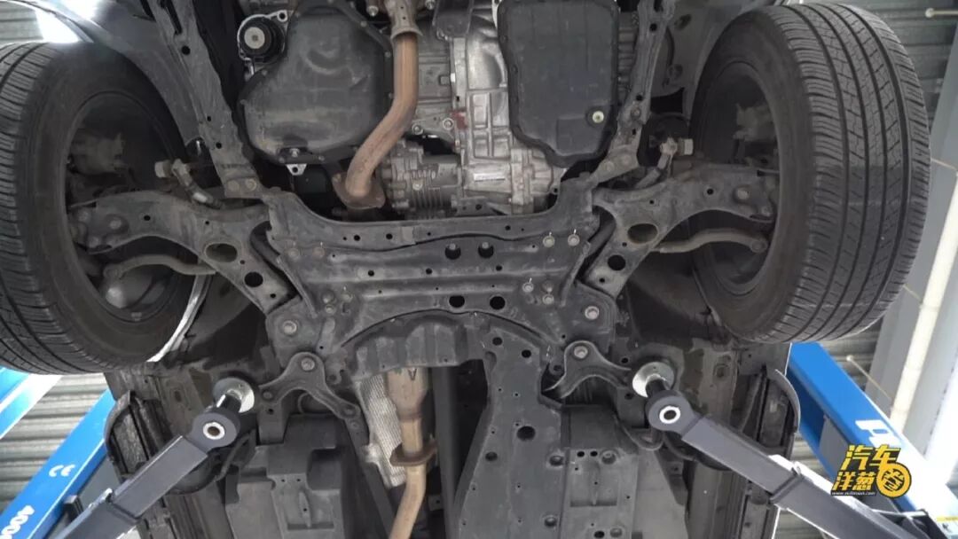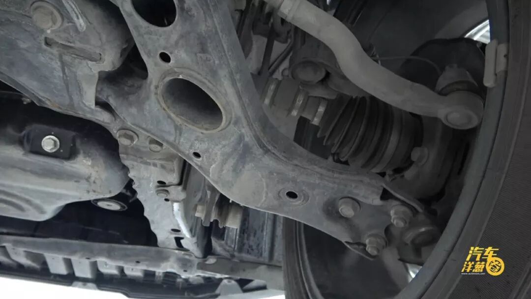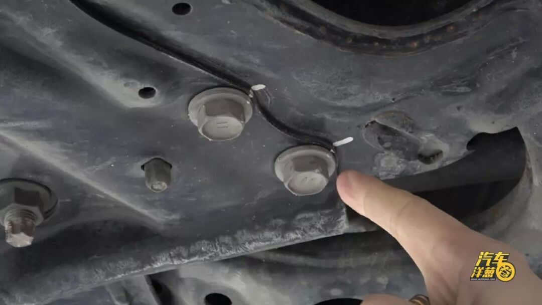 首先,先看它的元宝梁有没有损坏,它是承托发动机、变速箱的重要部件,也是副车架的一部分,想观察它是否拆过,也是看螺丝是否拧过。