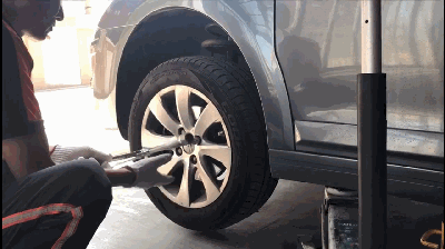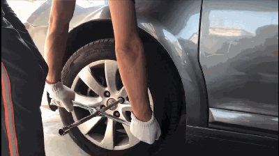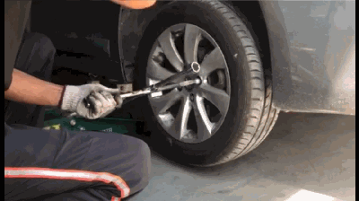 ⑥将车轮落地后,继续以螺栓的规定扭矩(一般十牛)拧紧轮胎的固定螺栓,收好废胎及工具即可。