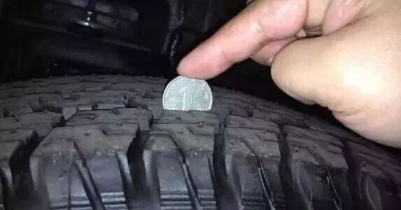 还有一种就是拿个一块钱的硬币出来,你直接就把它插在这个轮胎的花纹里面。