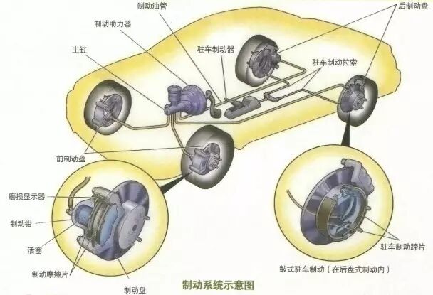 当我们踩下刹车(学名制动器)踏板时,汽车会减速直到停车。但这个工作是怎么完成的?人腿部的力量是怎么传到车轮的?这个力量是怎么被扩大以至能让一台笨重的汽车停下来的? 汽车之所以能停下来,是制动盘和制动片相互作用的结果。制动盘固定在车轮上,随车轮转动,两个制动片(brake pad)分别通过制动钳(caliper)装在制动盘(disk)的两侧。 如图7所示为汽车制动示意图,要让笨重的汽车停下来,靠的是液压系统。