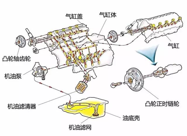 机油平常储存在发动机下部的油底壳(oil pan)中,如图9所示,当发动机运转时,利用发动机动力的一部分带动机油泵将机油抽上来,再利用泵的压力将其送至发动机的各个需要润滑的部位。润滑后的机油再变成油滴沿壁落回到油底壳中,然后再被抽上来继续润滑各部件,如此重复循环使用。