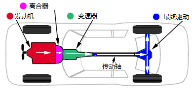 发动机出来的动力如何传到汽车轮子上呢?如图3所示,发动机动力经过离合器(torque converter)、变速器(transmission)、传动轴(driveshaft),最终传到车轮上。这里面有两个部件我们需要理解:离合器和变速器。