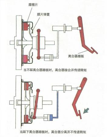 踩下离合器踏板,踏板克服离合器压盘的弹簧作用力,离合器分离;松开离合器踏板,弹簧压盘将摩擦片压向飞轮,再次使离合器接合。 离合器“半联动”是指离合器不完全联接的工作状态,即驾驶员部分踩下离合器踏板,造成飞轮与摩擦片之间处于边转边滑的状态。手动挡普通汽车需要使用半联动处理很多事情,但是过长时间的半联动会导致离合器磨损。