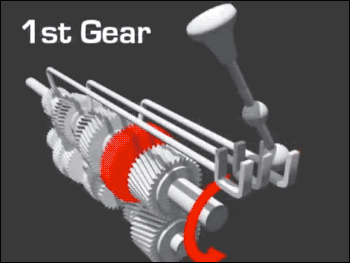 为什么需要变速器呢?不同的驾驶条件下需要不同的速度和转矩,比如,汽车在起步和爬坡时需要更大转矩 ,在同样的动力下,通过减小速度就可以获得较大的转矩。在平坦的道路上高速行驶时需要的转矩就小。 假如将发动机与驱动轮直接作用,那汽车就对应发动机的最高转速。很高且不变的速度是不现实的,所以变速器的作用就是获得不同的速度和扩大汽车的转矩,起步时用低挡,正常行驶时用高挡。 我们通过变速杆操纵不同挡位的速度,变速杆连着拨叉,实现不同传动比的齿轮啮合,下面的动画显示了换挡动作过程。