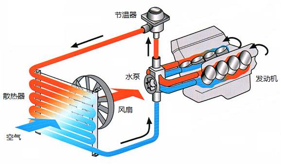 汽车只要一上路,要不了一会儿,引擎盖摸上去就会烫烫的。这是为什么呢? 从第一个问题分析中我们知道:在发动机的做功行程中,可燃混合气发生爆炸,这个温度很高,达到1000℃——难怪冬天汽车里温暖如春,夏天则挥汗如雨。而发动机最适宜的工作温度是90℃左右,所以发动机需要一个冷却系统。 冷却原理很简单,如图10所示,水泵(water pump)将冷水(蓝色)从散热器水箱(tank)里抽到发动机气缸体的水套(water channel)里,从发动机出来的热水(红色)回到散热器水箱,与空气进行热量交换。
