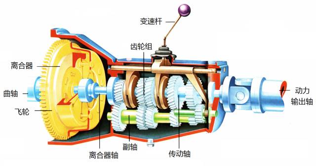变速器(gear box)就是一组齿轮,通过不同大小的齿轮啮合,就能实现对发动机转矩和转速的调整。如图6所示。
