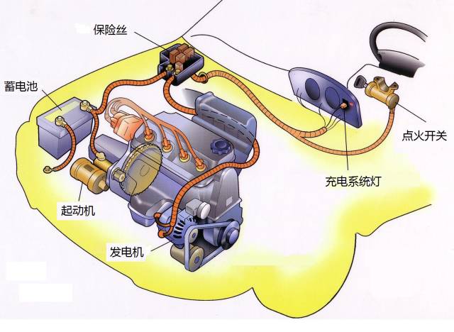 汽油车虽然不靠电能驱动,但其附件装置(如照明与信号装置、仪表盘、雨刮器等)、部件的控制却需要电路。比如,车灯怎么会亮的呢?忘了关车灯,第二天汽车就发动不起来了,这又是为什么呢? 其实,汽车里有个发电机(alternator),还有个蓄电池(battery)。发电机通过皮带(belt)与发动机曲轴连接,把汽车行驶过程中产生的动能转换成电能,给汽车提供直流12V电源,并通过蓄电池(俗称电瓶) 储存起来,如图12所示。