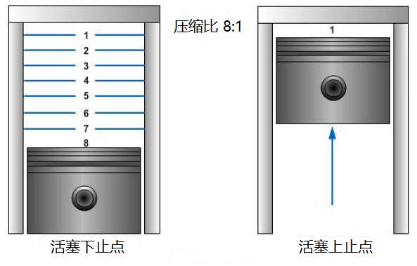 四冲程(即进气、压缩、做功、排气)发动机每完成一个工作循环,进排气门开启一次,曲轴转两圈,即720°。例如,当发动机转速为3000转/分时,同一气缸的进气门在1分钟时间内开闭次数应该是1500。 经常听到压缩比(Compression Ratio,简称CR)这个名词,它是指发动机可燃混合气被压缩的程度,用压缩前的气缸总容积与压缩后的气缸容积(即燃烧室容积)之比,如图2所示。