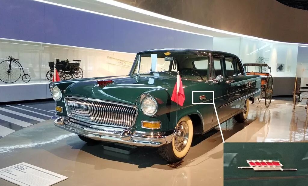 红旗CA72是中国最早投入使用的高级轿车,这一批CA72前格栅采用了中国传统折扇的造型,尾灯则参考了传统宫灯,最明显的特征莫过于前翼子板上的五面红旗,分别代表着工、农、商、学、兵。而后期的红旗则都改为了三面红旗,分别代表“总路线、大跃进、人民公社“。参观完博物馆里各个时代的红旗车,再想想今天用于国宾专车的红旗L5,不得不说历代红旗车都被打上了深深的时代烙印。