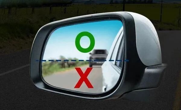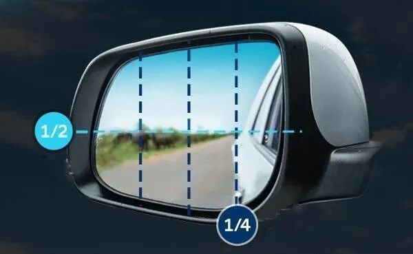 那么,先来看一下正确的侧视镜设置方法吧。先按照上面的图片,把镜子分成四等份,使其车辆进入镜子面积的1/4区域内,调节左右的角度。上下角度可以以道路的地平线为基准进行调整。 将镜子横向分成两半,然后放置在1/2处,使之与地平线对齐。考虑司机平时驾驶的驾驶姿势、车座位置等因素,会有助于寻找最佳位置。