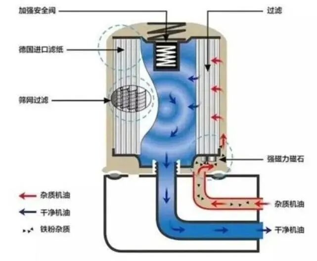 在机油滤清器中有一个旁通阀,这个阀会在机油滤清器堵塞时开启,避免发动机得不到机油的润滑。如果我们长时间不换机油滤清器,滤纸上吸附的杂质过多,机油无法通过了,就会打开旁通阀,机油不经过过滤直接供给发动机。最通俗的说就是相当于没有机油滤清器了,此时机油中残存的积碳、胶质、油泥、金属磨屑等就会随着机油的流动进入到发动机各个润滑表面,从而加剧发动机的磨损。