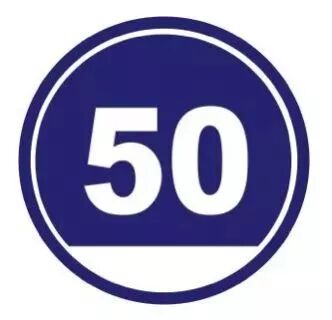蓝色圆圈内用白色文字标明数字,而且下方还有一截白底,表示机动车驶入前方道路的最低限速。一般设在高速公路或其他道路限速段的起点。以图为例,限制行驶速度不低于50km/h。