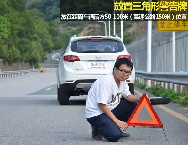 当确认安全后应立即摆放好三角警示牌。三角牌的位置,放在距离车辆后方50-150米的位置,而如果是高速路则要放在在车后150米的地方;在能见度较低的雨雾天气或者夜晚里,需要把警示牌设立在车后100米的地方。