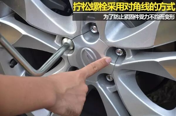 在拆卸轮胎的时候不要马上就把千斤顶将车顶起,必须先用螺丝摇臂将轮子上的螺丝逐一拧松,在拧松这些螺栓时,要采用对角线逐一拧松的方法,这样是为了防止紧固件受力不均而变形。