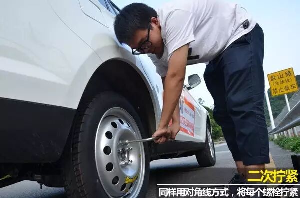 注意一点装备胎时不要一口气把一个螺丝拧紧,而是依旧按照对角线的顺序轮流拧紧,而在拧螺丝时最好每颗螺丝拧的圈数保持一致,为的是保证螺丝受力均匀。