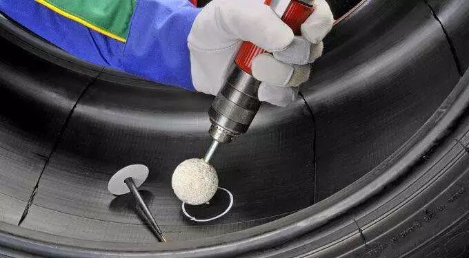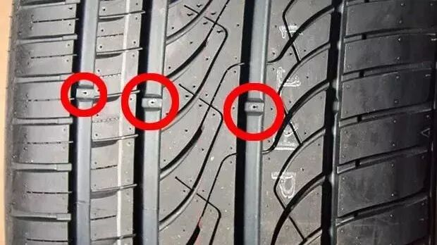胎面损耗接近磨损标记:前轮的话,把方向打死,胎面就露出来了,沟槽里面可以看到有凸起的小橡胶块,就是磨损指示点了。
