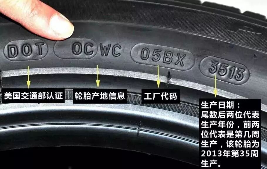 生产日期在轮胎的侧面,它是个4位数,是个圆圈框在那边的,后面2位数表示生产年份,前面2位数表示是第几周生产的。