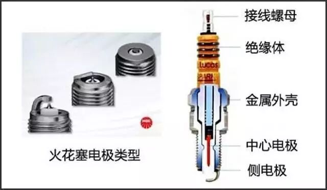 火花塞上的接地电极与金属壳体连接,通过汽缸盖螺纹连接连接到发动机缸体上。绝缘体主要起到隔离金属壳体及中央电极的作用。接线螺母是火花塞上与高压线圈接触的部分,电流通过接线螺母和中央电极后,击穿中央电极与接地电极间的介质产生火花,从而点燃气缸中的混合气。