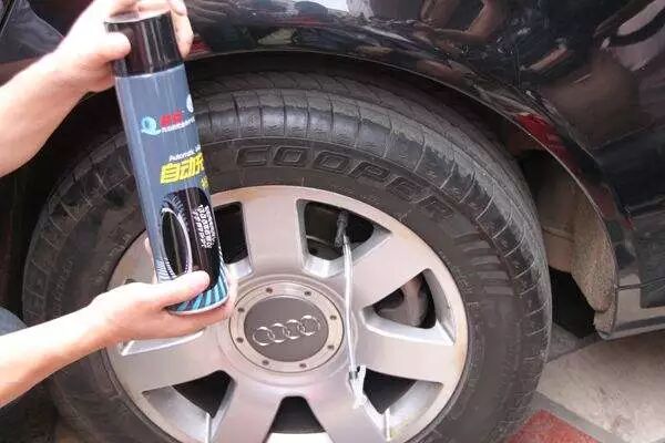 当轮胎被扎破漏气后,只要将补胎剂连接到轮胎上面,按下补胎剂的阀门,会自动往轮胎里加压缩空气,同时也会注入像发胶一样的白色的补胎胶。待轮胎压正常后,开动汽车就能再次在路上行驶。