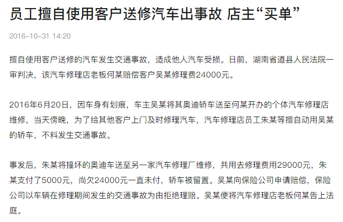 当车主选择前往汽修店修车,尤其是短时间内维修不好的时候,往往都会放在维修点,然后等过两天再来取车。但你可能不知道,现在不少维修店都有将顾客汽车私用的情况发生。开着你的车出门办个事情,吃个饭之类的还算小事,一旦发生交通事故,那就麻烦大了。