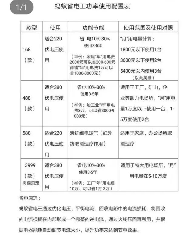 公司所有产品均一年包换,可使用5-8年 1.蚂蚁省电王168元(220伏电压) 使用范围:每月500度电内使用一台效果最佳(超过叠加) 2.蚂蚁省电王488元(380伏电压) 使用范围:每月5000度电内使用一台效果最佳(超过叠加) 3.蚂蚁省电王3999元(380伏电压) 使用范围:每月3万度电内使用一台效果最佳(超过叠加) 4.蚂蚁省电王12,800元(380伏电压) 使用范围:每月10万度以内使用一台效果最佳(超过叠加) 5.蚂蚁省电王498元新品(使用范围民用电压220伏) 每月1000--3000度以内使用一台效果最佳,以此类推(可以净化空气,除甲醛,PM2.5,防雷击,防辐射,释放负离子