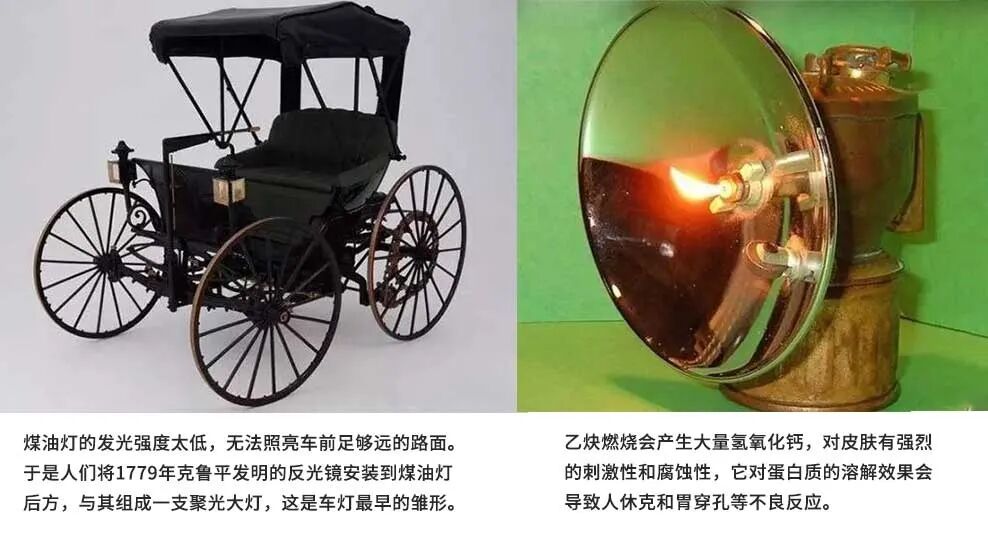 由于煤油灯发光效率低下,很快被乙炔灯替代。乙炔车灯利用安置在脚踏板或车架上的乙炔发生器,由碳化钙(俗称电石)和水发生化学反应而产生。