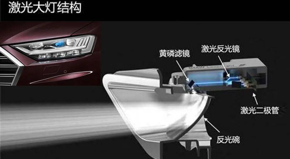 其原理是激光发光二极管的蓝光灯贯穿前大灯单元内的荧光材料,将其转换成一个扩散的白光。