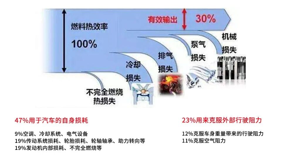 然而燃油燃烧所产生的化学能仅有30%转化为了有效动能,其余的70%都被损耗掉了。
