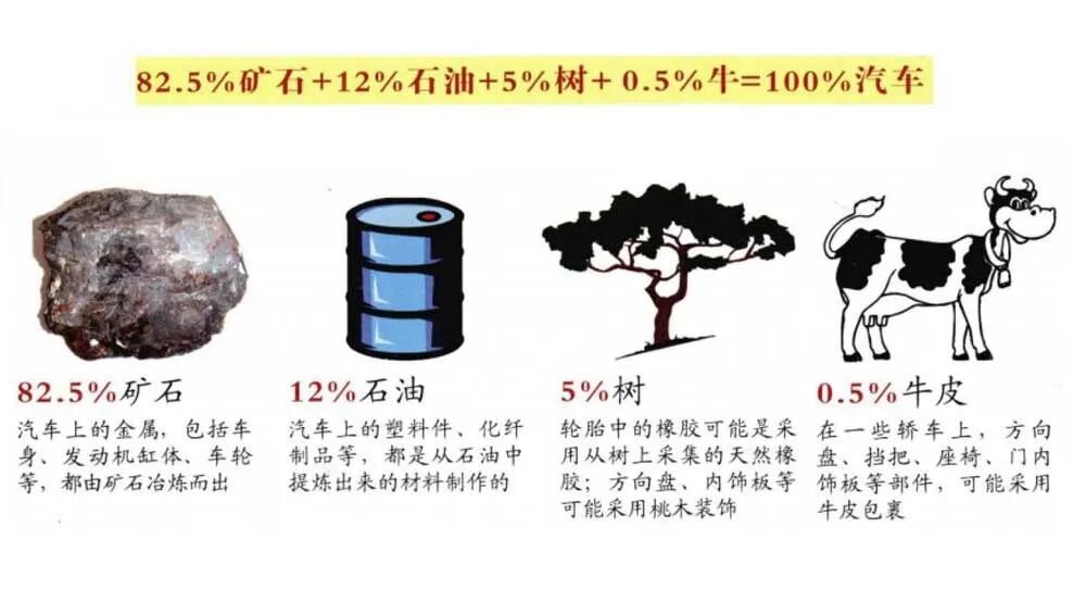 你会发现组成汽车的众多零部件都来源于:矿石+石油+树木+牛皮,这四种物质。