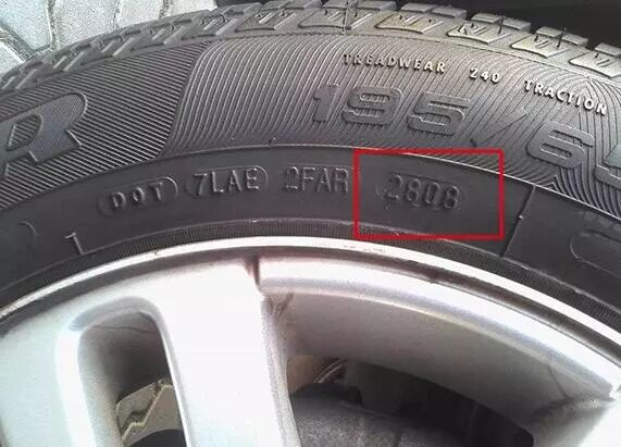 轮胎可以算得上是车上损耗最大的零部件了,基本上跑5-8万公里,在5年以内就得换,所以如何在购买二手车的时候发现超过5年胎龄一定要注意。轮胎的生产日期是比较容易看的,在这个椭圆形的小圈里有4个数字,后两个是年份,前两个是本年的第几周,上图所示就为2008年的第28周,也就是7月份左右,这样就可以很快推算出生产日期。