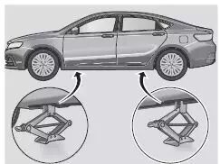 举升车辆时如果千斤顶支撑位置不正确会损坏车辆,甚至使车辆翻落。为避免人身伤害和车辆损坏,在举升车辆前,要确保千斤顶顶头处于正确的位置。千斤顶的正确位置如下图所示: