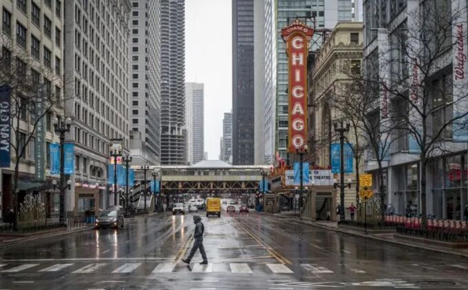 受新冠疫情影响,往日车水马龙的芝加哥闹市区少有车辆